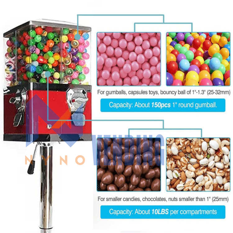 Yes, if the gumball’s size and shape fit your machine’s dispensing wheel. For 4 IN 1 large coin operated candy machine, it can dispense smaller than 1” candy, chocolates or nuts with candy wheel inside machine; with gumball wheel inside candy machine , it can be used to sell 25 to 35 mm ( 1″-1.4″ ) gumball, capsule toys, bouncy ball, pinball ). Check your machine’s specs for compatibility or consult bulk vending machine factory Nynovending.com for specific guidance